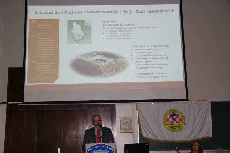 Prikaz rada Operativno komunikacijskog centra u policijskoj upravi Schwaben Nord, Augsburg, Njemačka dao je gosp. Robert Maschke policijski savjetnik, voditelj Operativno-komunikacijskog centra policije a Operativno-komunikacijskog centra u Policijskoj upravi zagrebačkoj gosp. Bono Rajić, pomoćnik voditelja Operativno- komunikacijskog centra. Nakon održanog predavanja i komparativnog prikaza dvaju modela rada uslijedila je otvorena stručna rasprava u kojoj se pokušalo dati odgovore na neka temeljna pitanja :